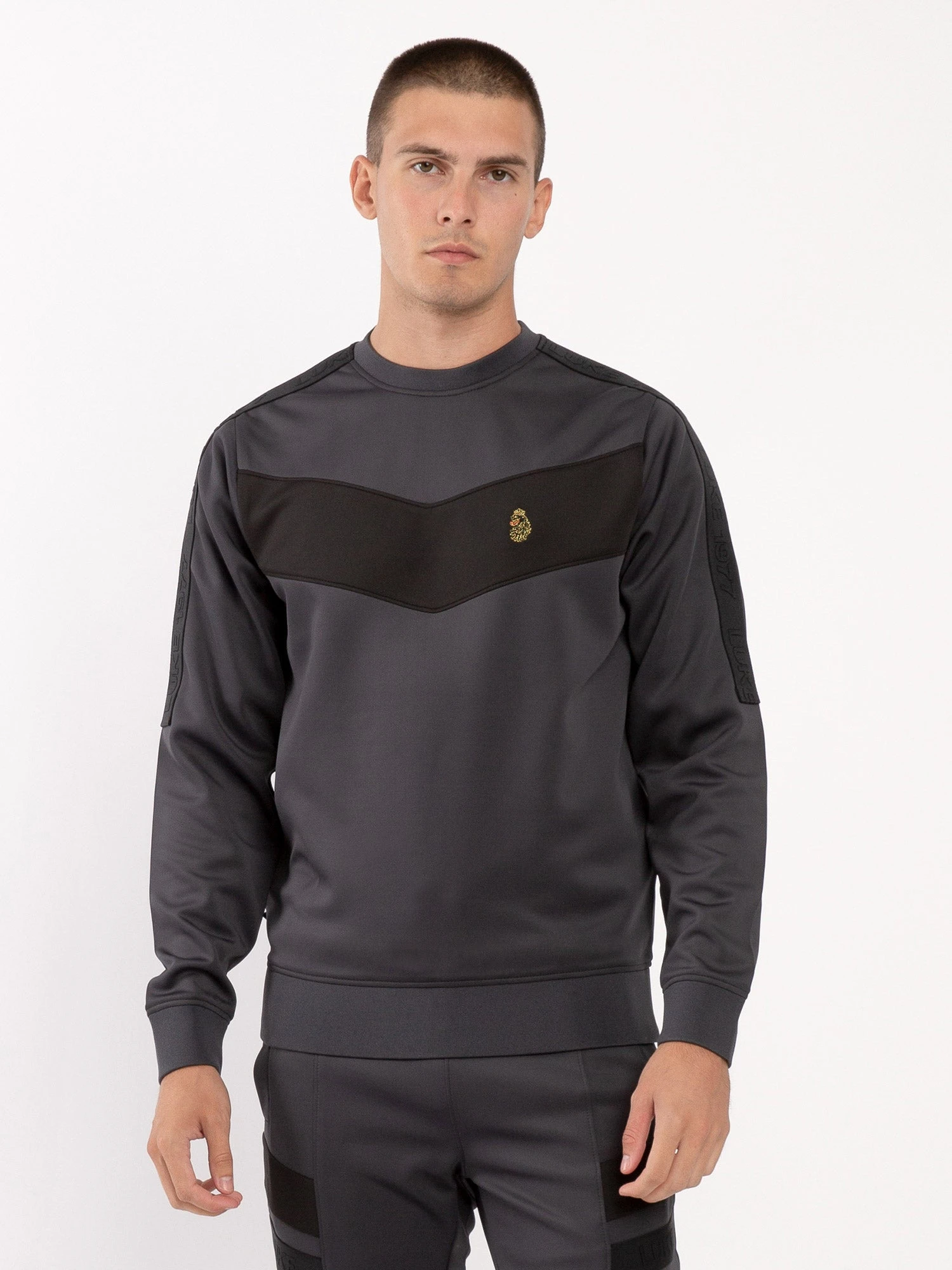 Comfortable, cool and classic, this crew neck sweatshirt from LUKE is cut from a stretchy tricot and features a cut and sew chevron chest panel. It is detailed with the LUKE 1977 raised text tape on the shoulders and sleeve and is complete with the brand’s iconic lion head on the left chest.