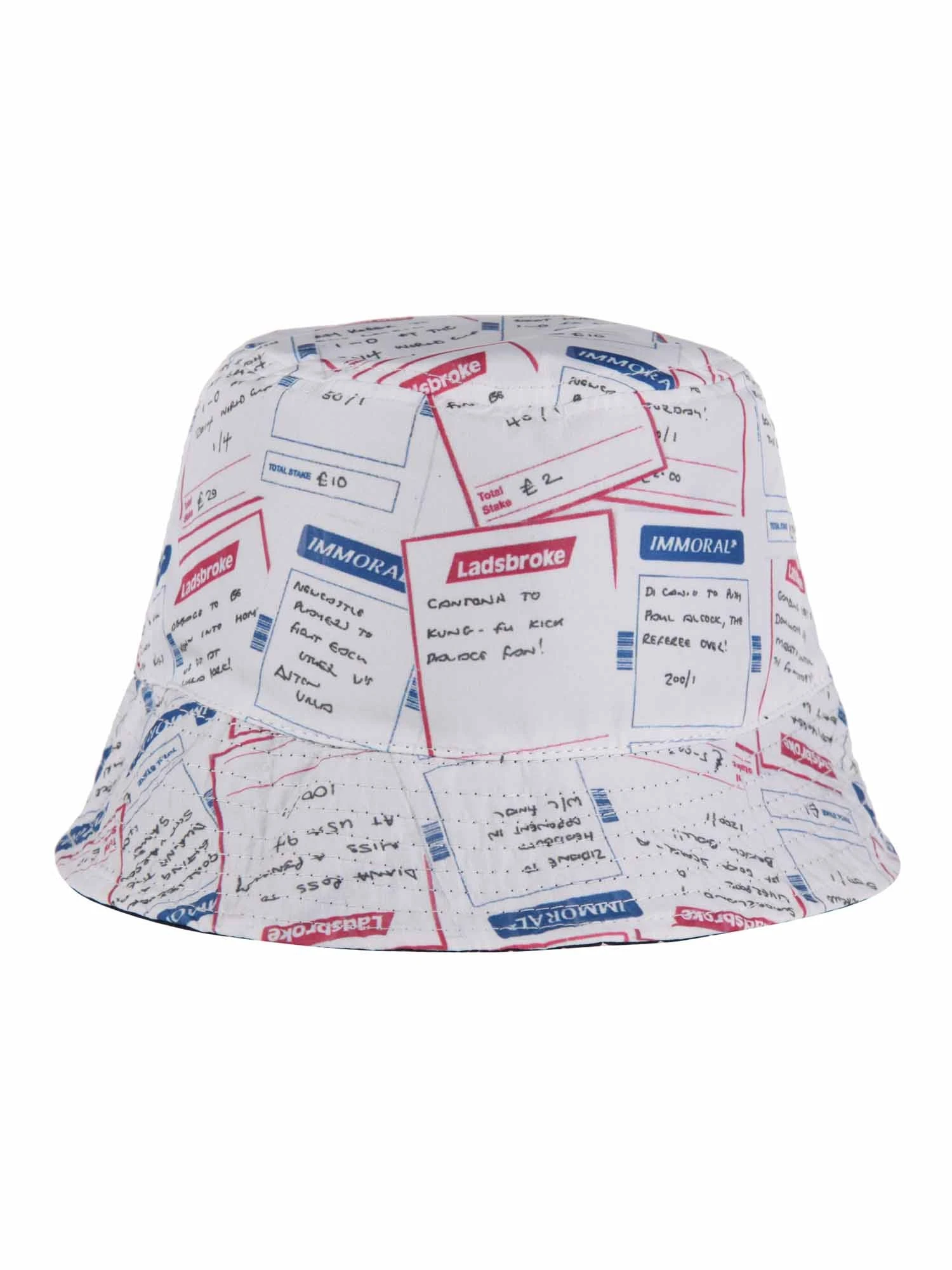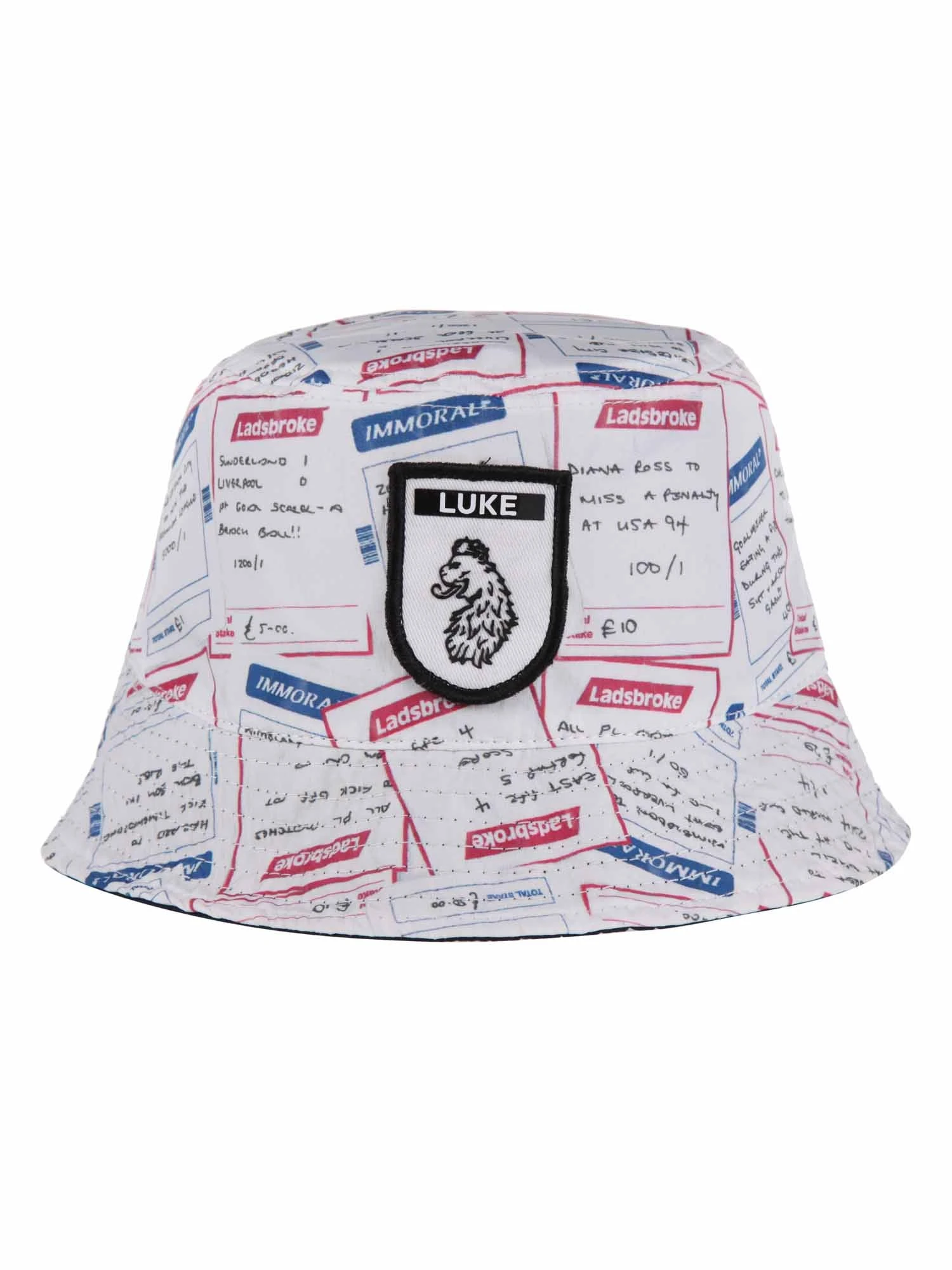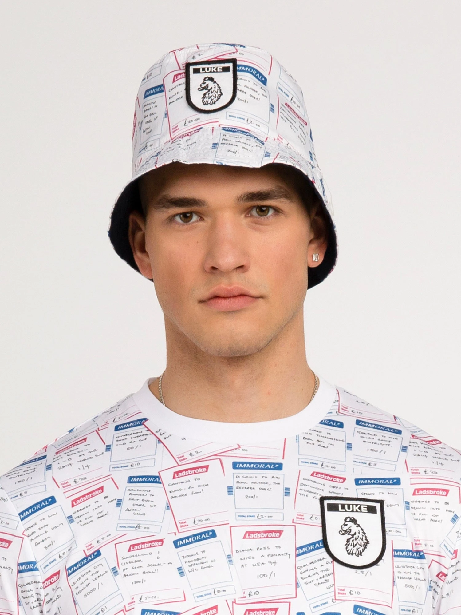 Your retro inspired terrace ‘fit isn’t complete without a cool bucket hat- and this one from LUKE is reversible, featuring an all over football betting slips repeat print on one side and plain navy on the other. The look is then signed off with a woven LUKE lion badge at the front. Pair with its matching football tee for statement summer style.