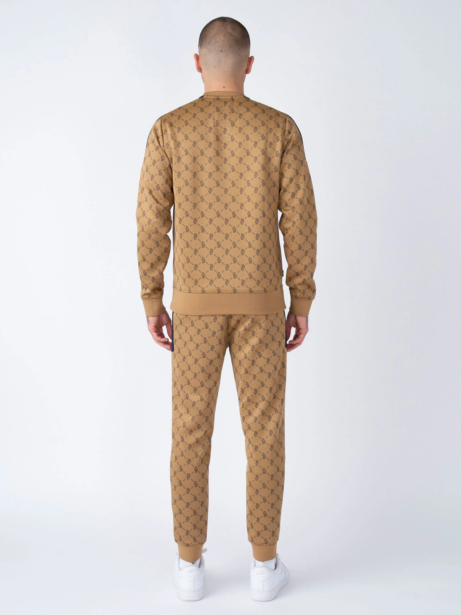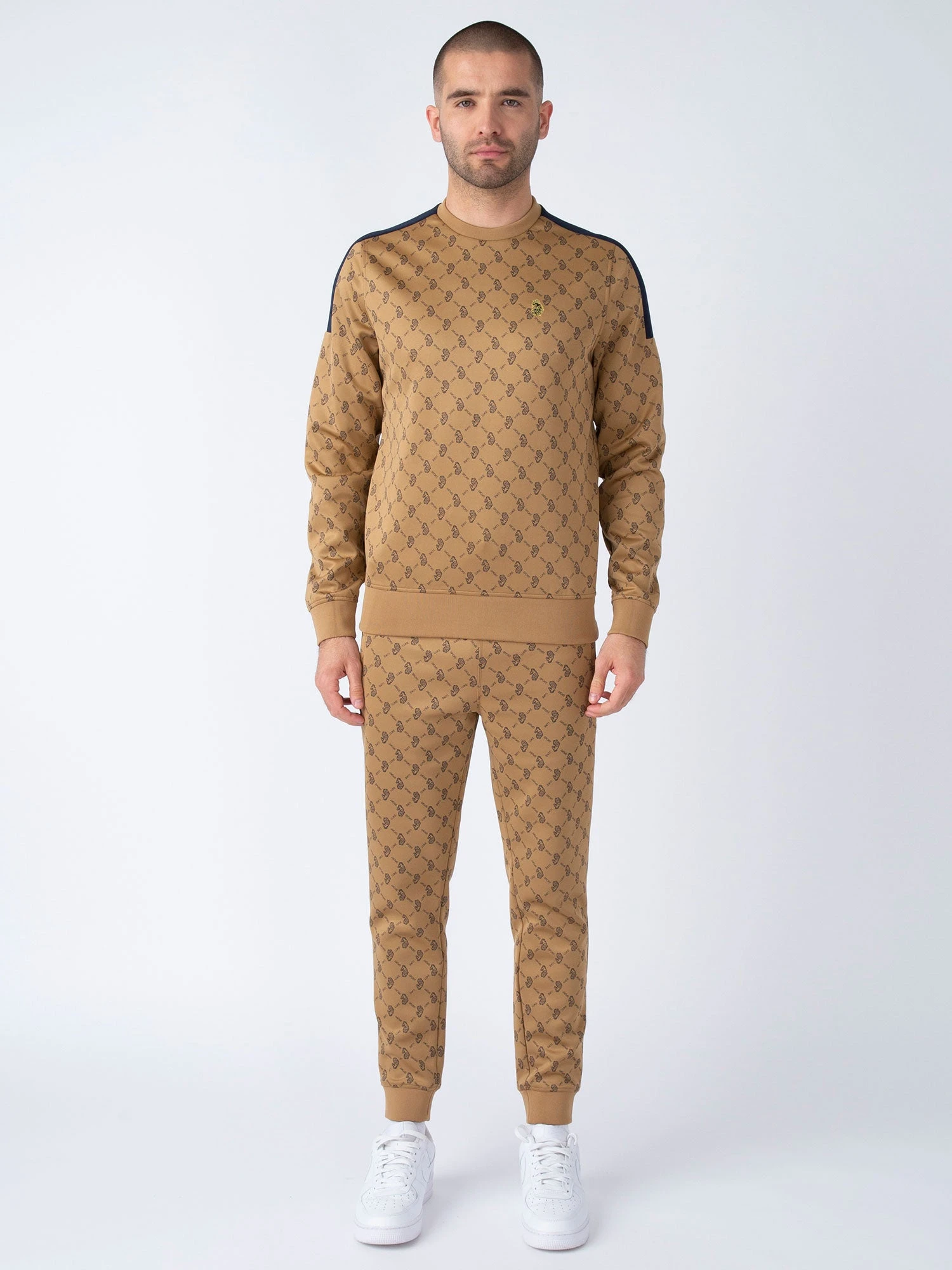 Our luxury tricot sweatshirt & joggers set from LUKE have been elevated this season with an all over LUKE SPORT repeat print. Crew neck sweatshirt features a contrast solid colour shoulder/sleeve panel and is detailed with soft rib trims throughout. Joggers are detailed with chrome metal trims. They are fitted with soft rib cuffs and a drawcord waist – perfect for comfy everyday wear. They feature essential front zip pockets. The look is then signed off with the brand’s iconic lion head embroidery on the left chest and left leg.