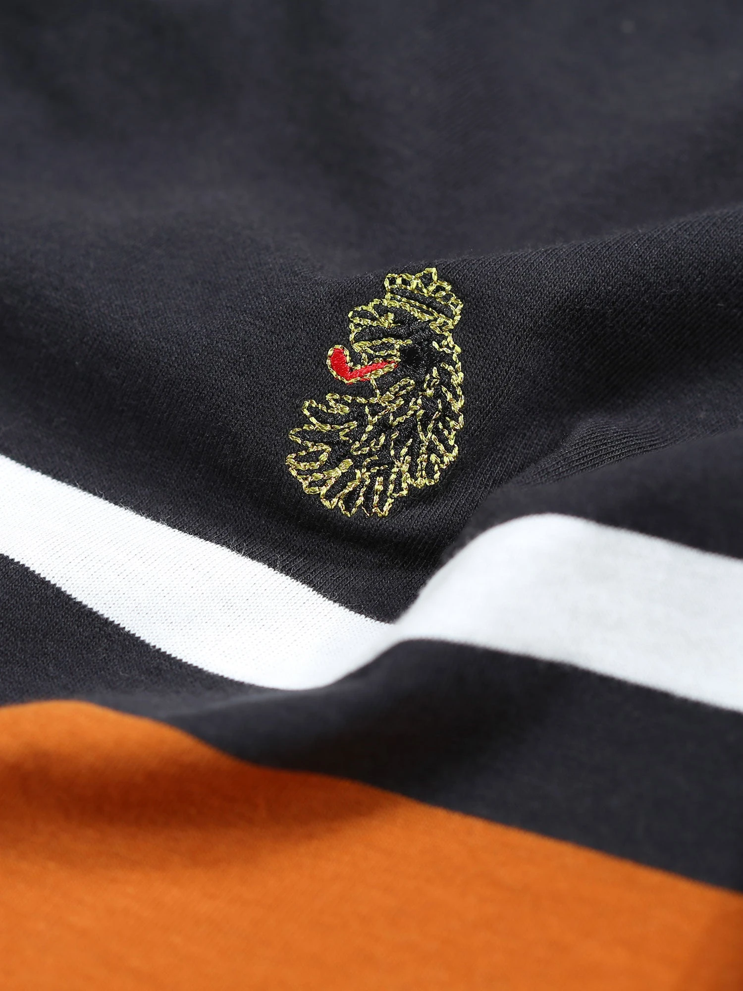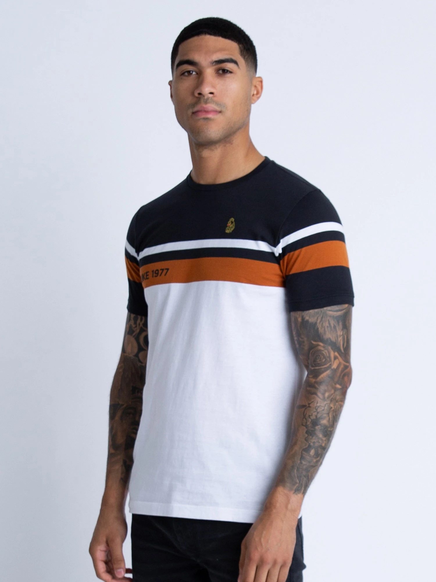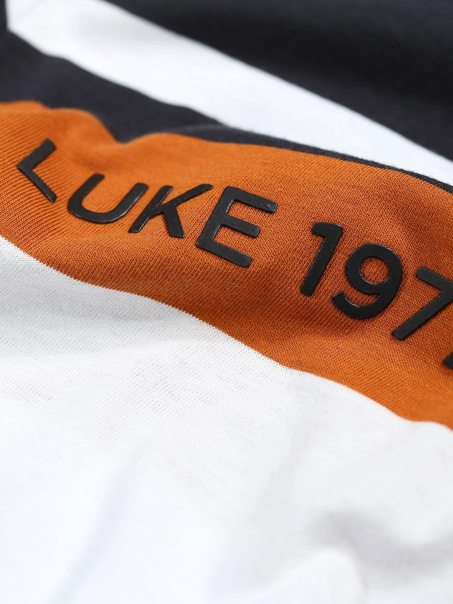 This classic crew neck tee from LUKE is crafted from a super soft pure cotton and features contrast colour blocking and yarn dyed stripes. It is detailed with a LUKE 1977 raised text print and complete with the brand’s iconic lion head embroidery on the left chest.