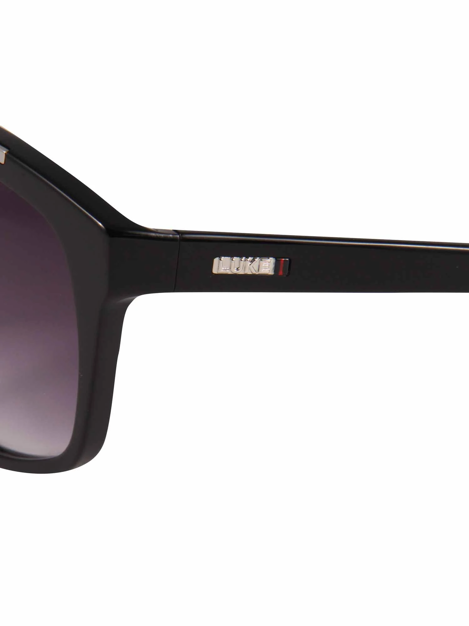 - LUKE branded metal plate with the bi-colour printed stripe on the left temple