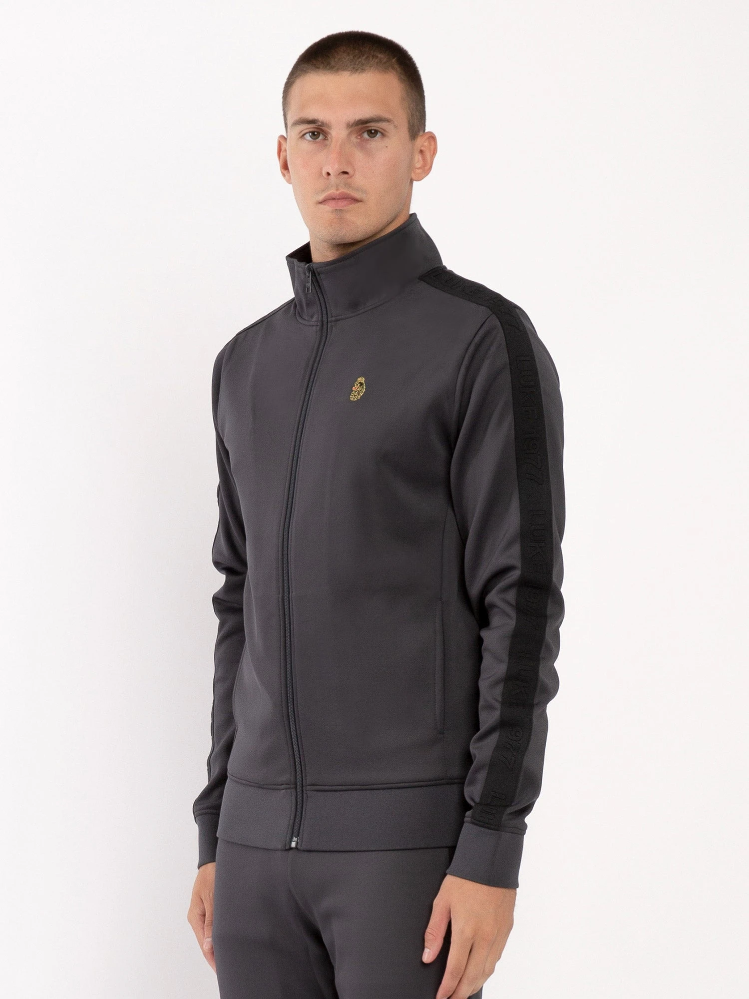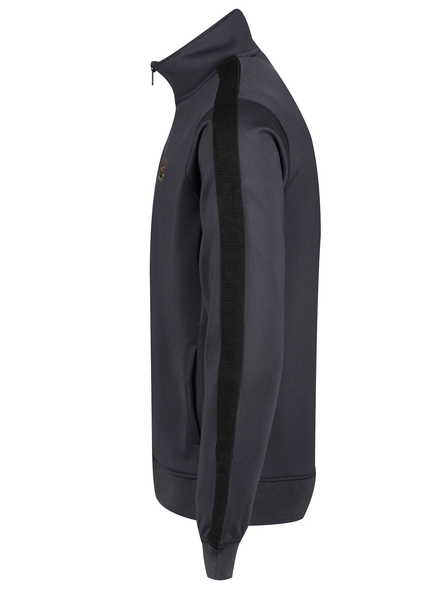 Comfortable, cool and classic, this funnel neck zip through sweat from LUKE is cut from a stretchy tricot and features a black LUKE 1977 raised text tape on the shoulders and down the sleeves. It is detailed with a soft ribbed cuff and hem and is complete with the brand’s iconic lion head embroidery on the left chest.