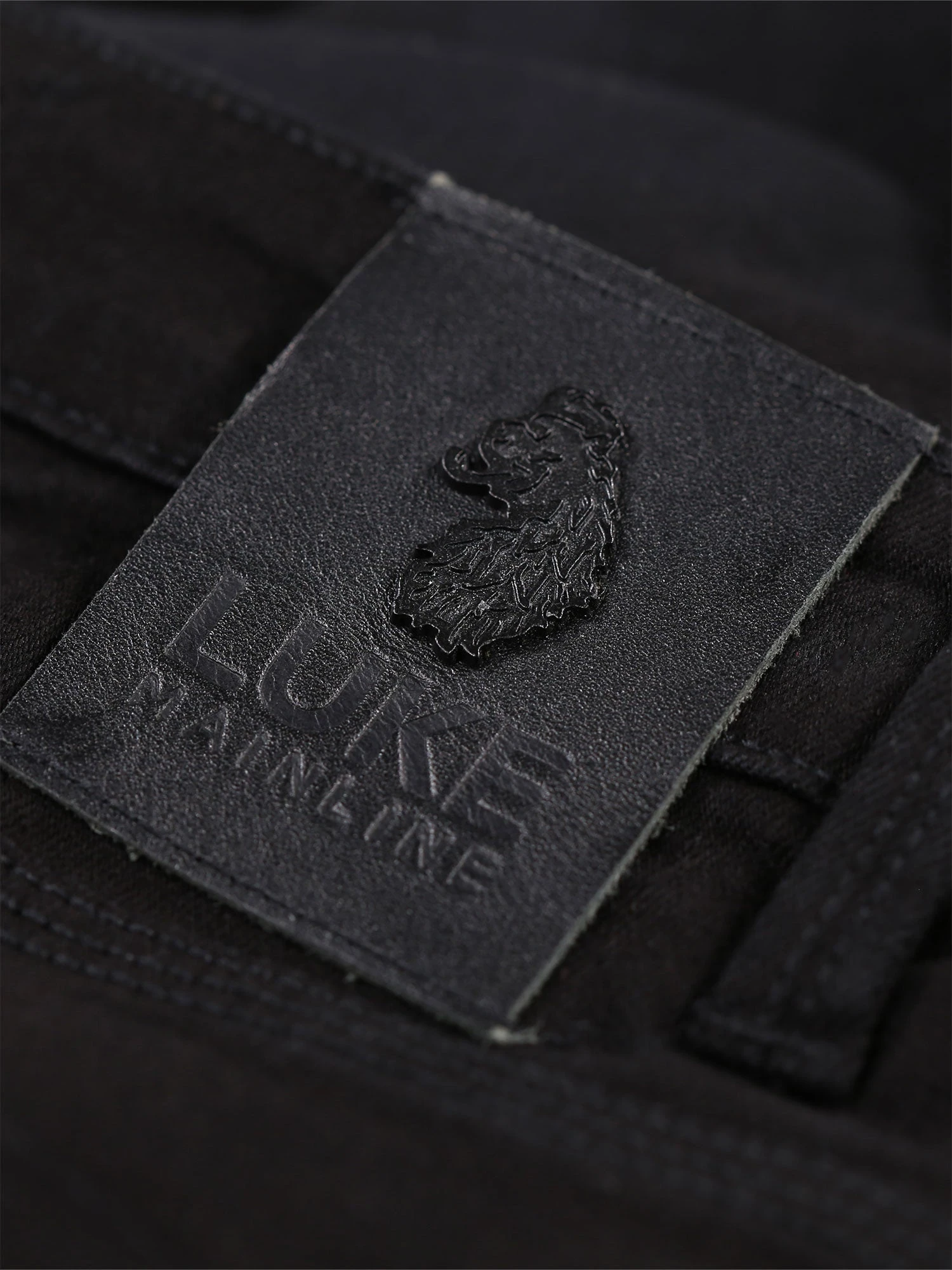 LUKE shows off a cool and contemporary aesthetic with these Vacuum denim jeans. The back waistband is decorated with a black faux leather patch which features a gloss lion rivet. These jeans are styled slim/tapered using a comfortable stretch-infused cotton denim and are completed with five handy pockets and a glossy summary fastening.